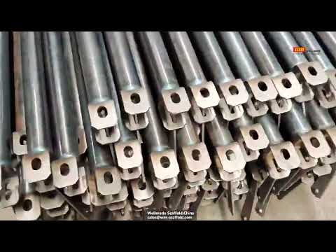 This is a manufacturing video of the quick-stage scaffolding ledgers. The ledgers are made of O.D. 48.3mm scaffold tube with pressing C clamps and a wedge key assembly.